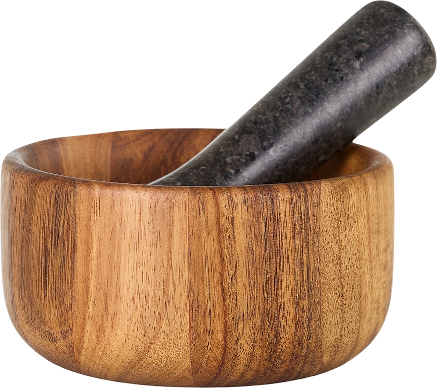 - Le bol en bois du mortier est agréable au toucher et stable, sa forme facilitant un broyage efficace des ingrédients.