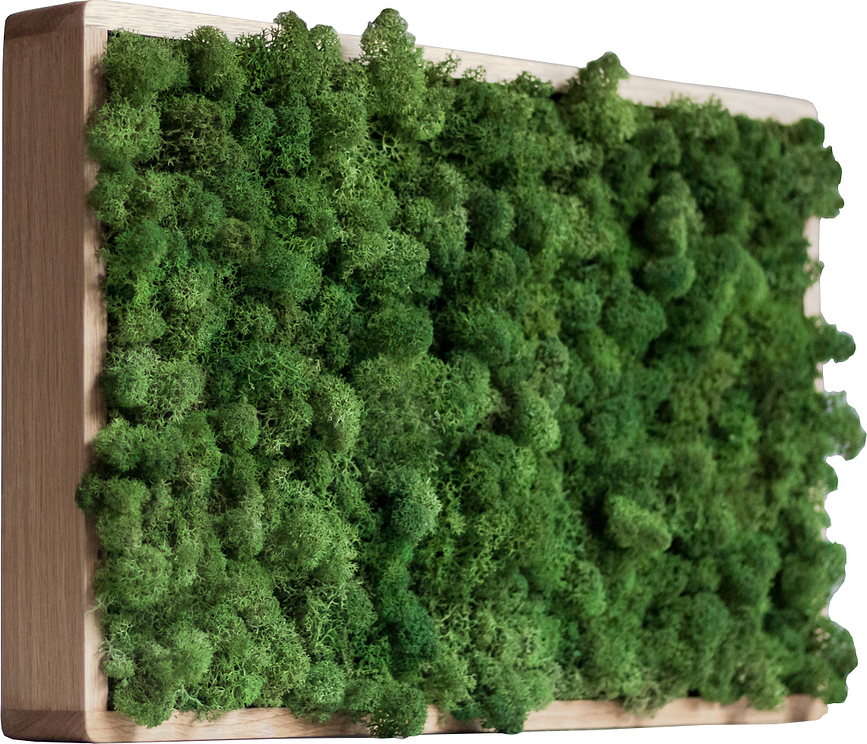 Cette décoration murale unilatérale est un cadre en chêne de la marque polonaise borcas. Il est rempli de lichen – le lichen des rennes – qui, en plus de son rôle décoratif, peut agir comme un hygromètre naturel.