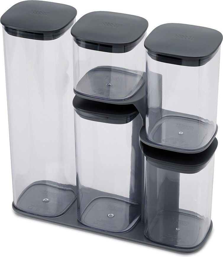 Voici un ensemble de récipients de la marque Joseph Joseph qui, même empilés les uns sur les autres, restent très pratiques à utiliser.