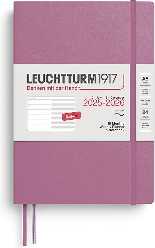 Versions disponibles :- Leuchtturm 1917 Agenda Semainier et Carnet Ligné 18 mois, couverture souple, 2025/2026, version anglaise, A5, vieux rose, Leuchtturm 1917 Agenda Hebdomadaire, couverture souple, avec carnet ligné, 18 mois 2025/2026, A5, orange, version anglaise, Leuchtturm 1917 Agenda Semainier 18 Mois 2025/2026, avec carnet de notes ligné, couverture souple, A5, bleu foncé, version EN, Leuchtturm 1917 Agenda Hebdomadaire 18 Mois, souple, avec pages lignées, A5, vert forêt, 2025/2026, version anglaise, Leuchtturm 1917 Agenda Semainier 18 mois 2025/2026, avec carnet ligné, couverture souple, format A5, vert clair, EN