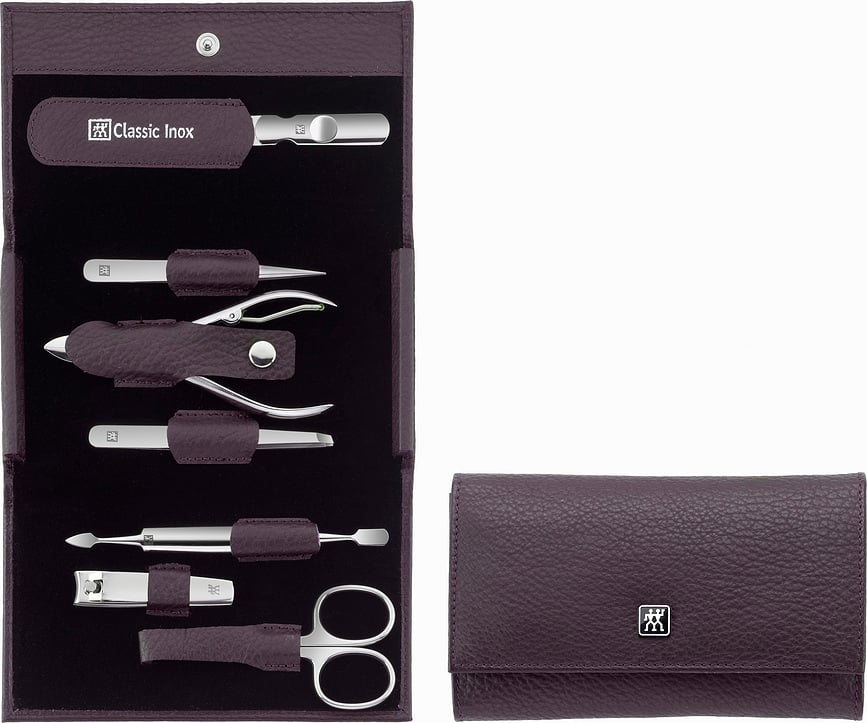 Versions disponibles :- Classic Inox Kit de Manucure avec étui en cuir horizontal, violet, Set 7 pièces, Classic Inox Trousse de Manucure horizontale, en cuir rouge, Set 7 pièces
